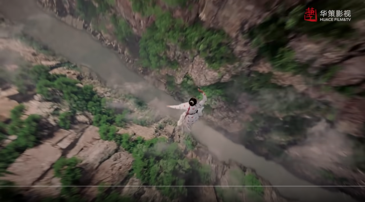 Li Chang Ge is fleeing her pursuers on horseback, galloping onto a rope bridge when the boards snap out from underneath her, sending her plunging into the raging river below.