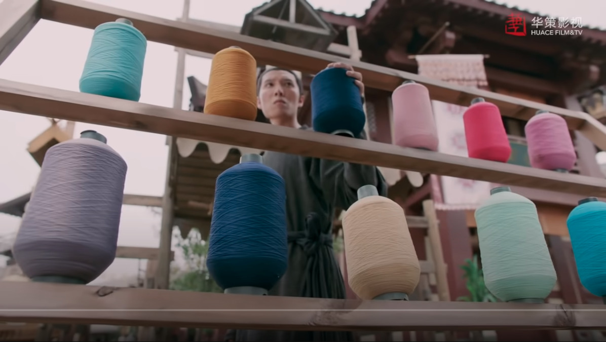 Cut to this guy selling colored thread, also presumably looking at the dude. Still low-angle with only the thread in focus. There's a whoosh sound effect and some speedup/slowdown and some inserted black frames to create a flashing effect for extra drama.